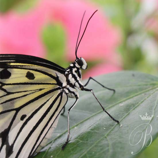 What a stunning butterfly. The Danaus Melanippus - Black Veined Tiger / White Tiger is a species found in Asia. My closeup photography captures a detailed view of this black & white beauty. Large patterned wings, a decorative body, covered in sensory hairs. Love the contrast of the pink flower Bx